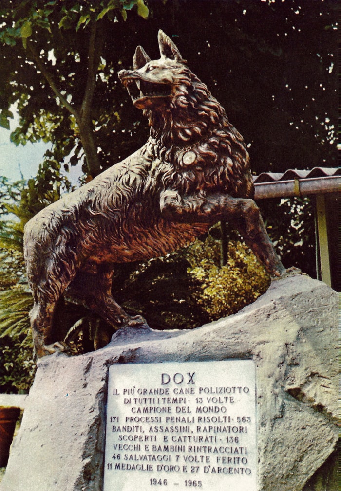 Vor circa dreißig Jahren befand wir uns mit der Familie in einem unserer Italien-Urlaube am römischen Meer. Von dort aus starteten wir einen Ausflug ins Blaue mit dem Wagen. Während der Fahrt fiel uns eine riesige Schäferhund-Statue auf, die hinter dem Gartenzaun eines Hauses stand und über den Zaun hinausragte.